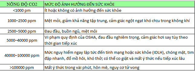 Ở mức CO₂ khoảng 1.000 ppm, vốn thường gặp trong các phòng họp, lớp học hoặc nhà ở thiếu thông gió, con người có thể cảm thấy giảm khả năng tập trung, mệt mỏi và khó chịu do không khí trở nên ngột ngạt. Mặc dù không gây nguy hiểm ngay lập tức, nhưng các mức CO₂ trung bình này vẫn ảnh hưởng đến hiệu suất làm việc và sự tỉnh táo. Việc duy trì chất lượng không khí tốt là yếu tố quan trọng để đảm bảo sức khỏe và hiệu quả hoạt động trong môi trường sống và làm việc.